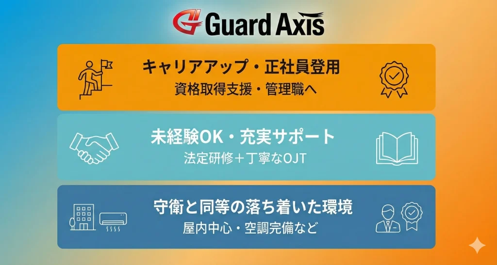 安定した環境で、警備のプロとしてキャリアを築きたい方。あなたの新しい一歩を、ガードアクシスは全力でサポートします。